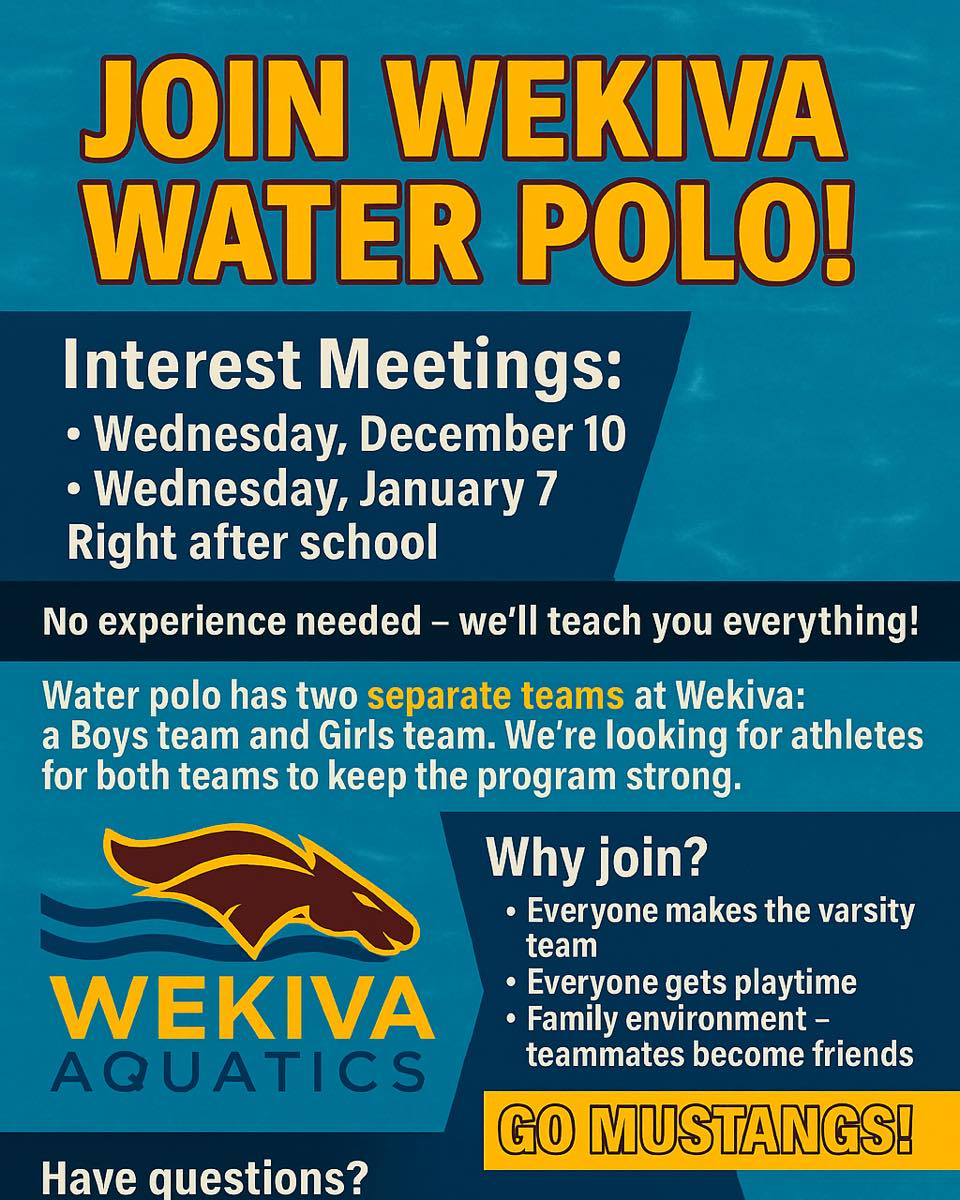 Wekiva Aquatics invites you to join the water polo team! Interest meetings will be held Wednesday, December 10, and Wednesday, January 7 immediately after school in Room 633. All experience levels (including no experience) are welcome! Contact Tiffany.Stieger@ocps.net with any questions.